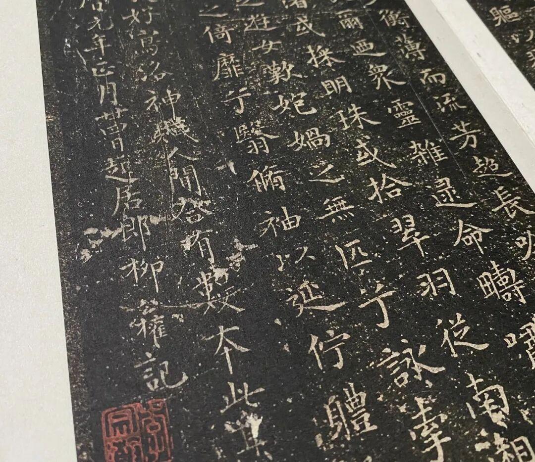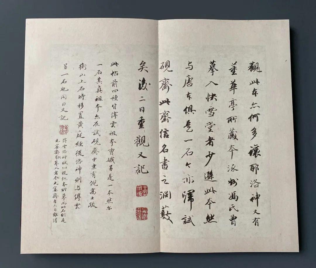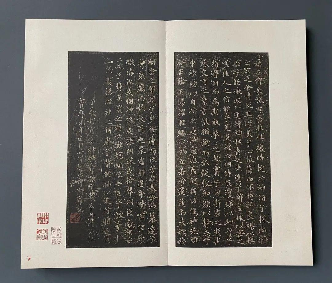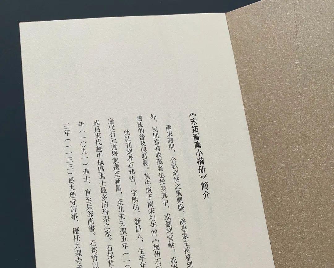 石邦哲藏書之外,又於紹興年間將家藏法書名跡摹刻入石,名《博古堂帖》,世稱《越州石氏帖》。南宋陳思《寶刻叢編》卷十三中有《石氏所刻歷代名帖》,是關於此帖情況的最早記錄。據之可知,該帖匯刻晉唐法書二十七種,其中小楷多達十六種,摹刻十分精善,其中《樂毅論》海字本傳爲摹自北宋學士高紳家藏刻石,《黃庭經》爲爲火後殘石本,而多種唐人名家小字,均爲他處所未見,成爲後世晉唐小楷流傳的重要源頭。由於原石已佚,僅有零星拓本傳世。至明代,文徵明、文彭父子刊刻的《停雲館法書》是刻帖中之翹楚,尤以第一卷晉唐小楷爲世所重,除小字《麻姑仙壇記》取南城本外,其餘皆以宋拓越州石氏本摹勒。也是從明代開始,就有好事者取文氏所刻停雲館本,或用所謂宋紙舊墨,或作隔麻,或重新翻刻,僞充宋拓。而真正的宋拓《越州石氏帖》,傳世僅知三種:其一爲臨川李氏舊藏小楷十一種,今藏日本東京國立博物館;其二爲《柳跋洛神賦十三行》單本,今藏私人處;其三爲《顔柳白米四家帖》,今藏中國國家博物館。三種之中,東京國立博物館所藏因其內容純爲小楷,出版最早、最多,影響最廣,是宋刻宋拓法帖的典型。