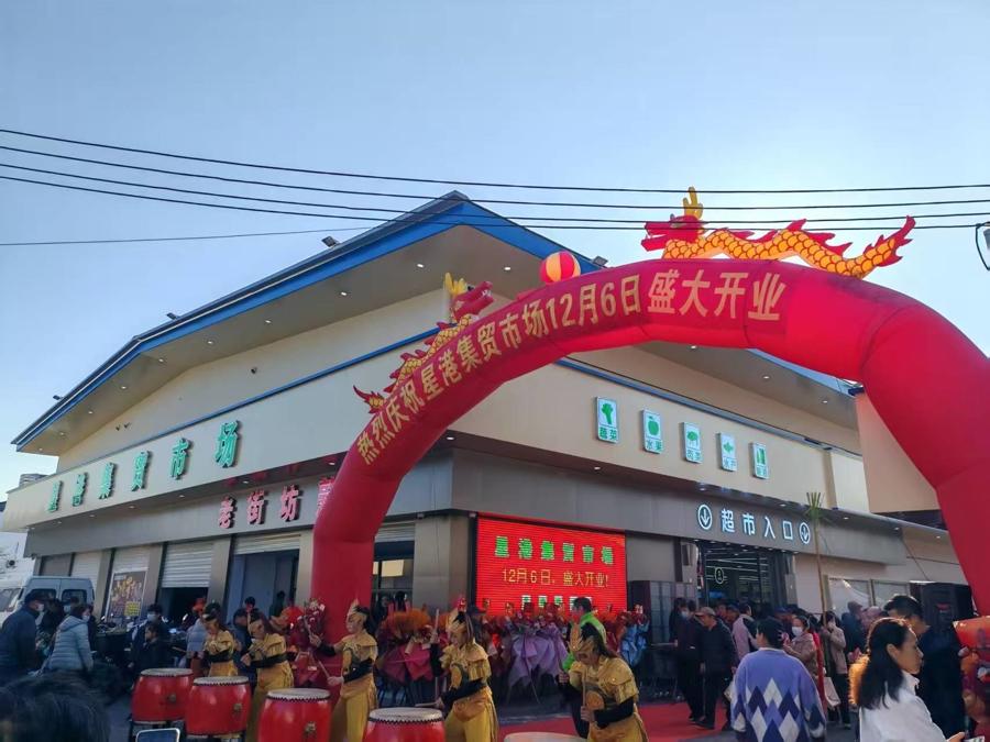改造後的星港集貿市場,以現代化生鮮超市的模式運作,不僅內部環境明亮整潔、過道寬敞通透,而且分區清晰合理,包括休閒食品區、日配冷藏區、酒水飲料區、米糧油麪區等,整合了蔬菜、肉類、水產、糧油、日常生活用品等各類商品,足以滿足周邊村民的日常生活需求。