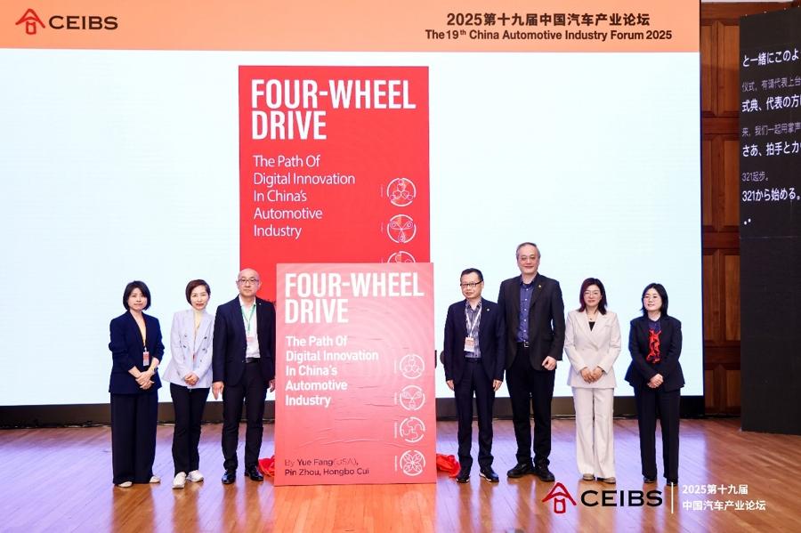 論壇現場,《四輪驅動:中國汽車產業的數智化創新之路》英文版舉行發佈儀式。中歐國際工商學院億緯鋰能經濟學與決策科學教席教授、中歐經濟學和決策科學系系主任、中歐AI與管理創新研究中心主任、AI與企業管理研究領域主任、企業數智化轉型課程聯席課程主任方躍作爲該書的主要發起者與主編,在發佈儀式上發表講話。他回顧道,自中歐校友汽車產業協會成立21年來,論壇已持續舉辦十九屆,見證了全球汽車產業百年未有之大變局,也記錄了中國汽車產業在新能源與智能化領域的躍升。