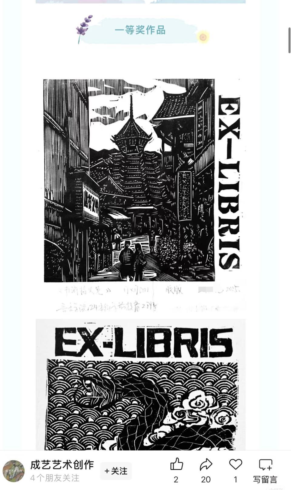 微信公衆號“成藝藝術創作”曾發文介紹了此次作品展,該展覽系由成藝大學藝術創作委員會、校圖書館、校團委聯合主辦的《世界讀書日版畫藏書票作品展》,展出了近200幅作品並評出了一、二、三等獎和創作獎。