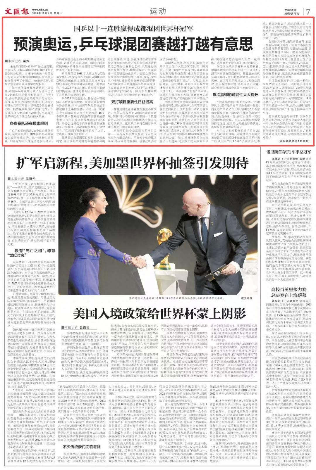 “每一次團體賽都能感覺到中國力量、中國乒乓球隊的力量。”現場採訪環節,女單名將王曼昱如此表示。今年4月,洛杉磯奧運會已確定取消男女團體項目,取而代之以混合團體項目,這項正式誕生只有三年的小項將成爲奧運賽場上唯一能體現乒乓球隊“團魂”之戰。作爲該項目入奧後的首次比賽,本屆混團世界盃就成了奧運會的初次預演。