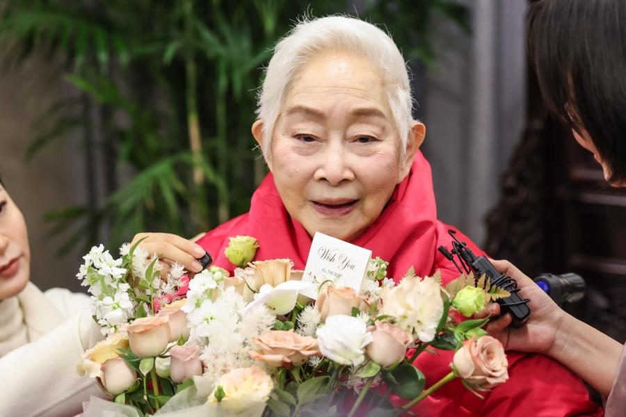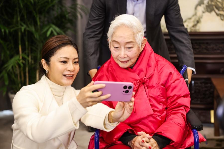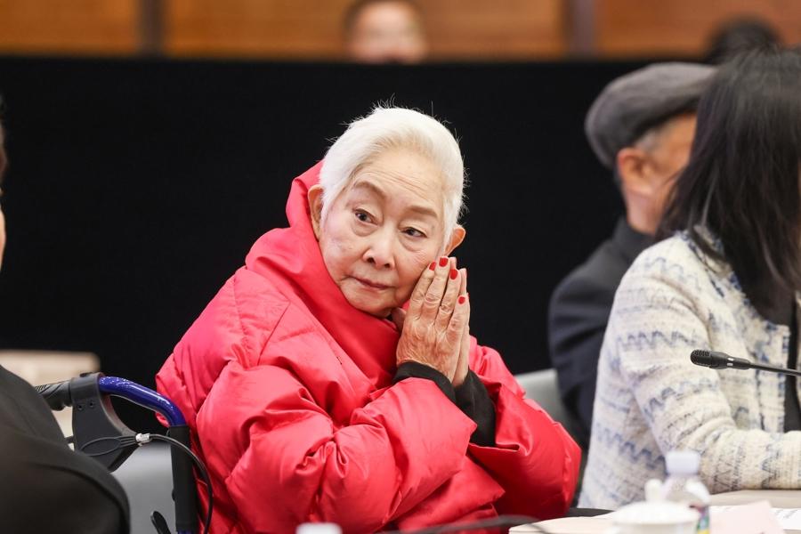 身穿一席大紅色外套的百歲影后盧燕返回母校上海交大,並與青年學子展開對話。