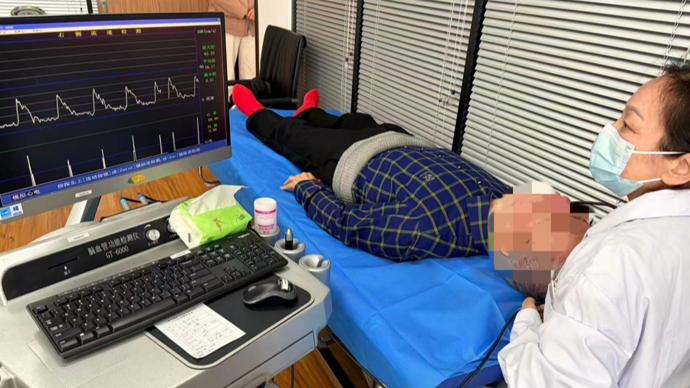將兩個探頭搭在受試者頭部,不到一分鐘,屏幕上就顯示出腦血流、腦血管彈性等信息,隨即一份腦卒中(俗稱“中風”)風險評分表就打印出來——在滿分爲100分的風險評估中,如果受試者得分低於75即爲中風高危個體,提示應儘快就醫。