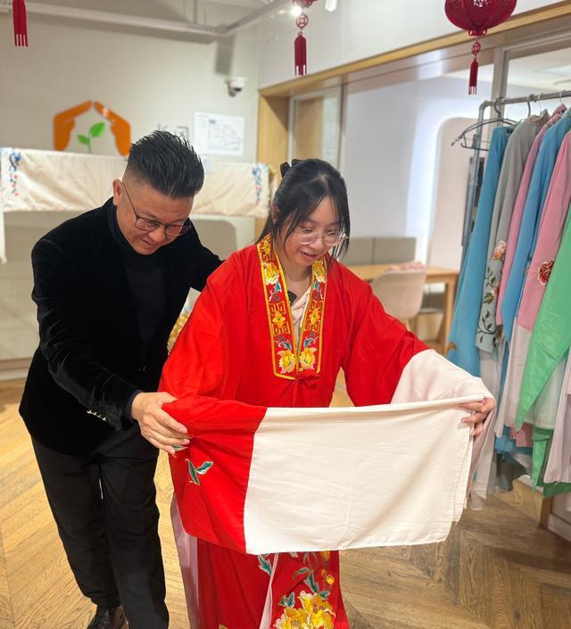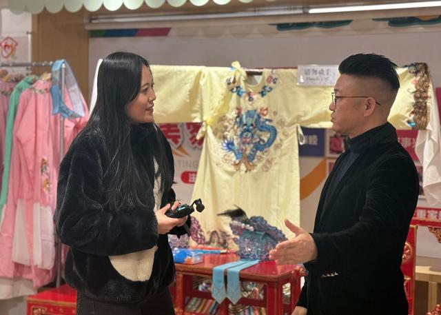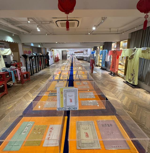 此外,一件件純真絲手繡戲服也讓人歎爲觀止。褶子、蟒袍、帔、百襉裙……淡雅柔美、簡潔清新。越劇的純真絲手繡戲服以針法細密、色彩清雅著稱,成爲舞臺美學的凝結,也折射出江南文化的溫婉。當聽說一件蟒袍製作的週期長達7個月甚至更久時,在場的參觀者無不發出一陣驚歎。純真絲手繡戲服的工藝也屬於非遺文化,一針一線都深刻承載了文化傳承和工藝價值。舞臺上,手繡戲服與演員的表演相映生輝,顯著地提升了越劇的觀賞性。它是越劇表演的視覺核心,更是文化傳承、工藝創新和社會連接的橋樑,爲越劇藝術的延續與發展提供了堅實的基礎。