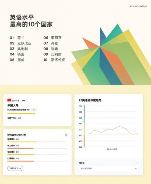中國大陸地區英語熟練度得分爲464分,全球排名第86位,較去年上升5位,仍處於低熟練度水平。21歲至25歲人羣以485分成爲得分最高年齡段,其優勢在今年新增的口語與寫作評估中尤爲明顯。在四項技能中,閱讀能力最強,寫作次之,口語與聽力相對較弱,這與全球非英語母語國家的整體情況基本一致。