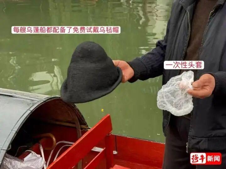 烏篷船工作人員向記者展示烏氈帽免費試戴流程