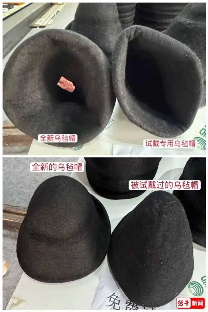 “你看,這頂專門供試戴的帽子,才用了一個多月,已經明顯走形了。”張阿姨將試戴帽與全新帽子對比。記者看到,試戴帽內部確實附着不少細小皮屑與灰塵,氈體也因多次撐拉而變得鬆弛。