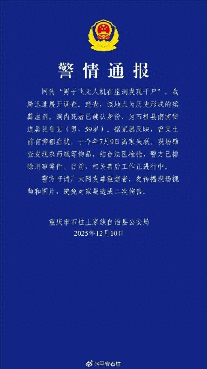 石柱土家族自治縣公安局12月10日通報,網傳“男子飛無人機在崖洞發現乾屍”,該局迅速展開調查。經查,該地點爲歷史形成的殯葬崖洞。洞內死者已確認身份,爲石柱縣南賓街道居民曾某(男,59歲)。據家屬反映,曾某生前有抑鬱症狀,於今年7月9日離家失聯。現場勘查發現農藥瓶等物品,結合法醫檢驗,警方已排除刑事案件。目前,相關善後工作正進行中。