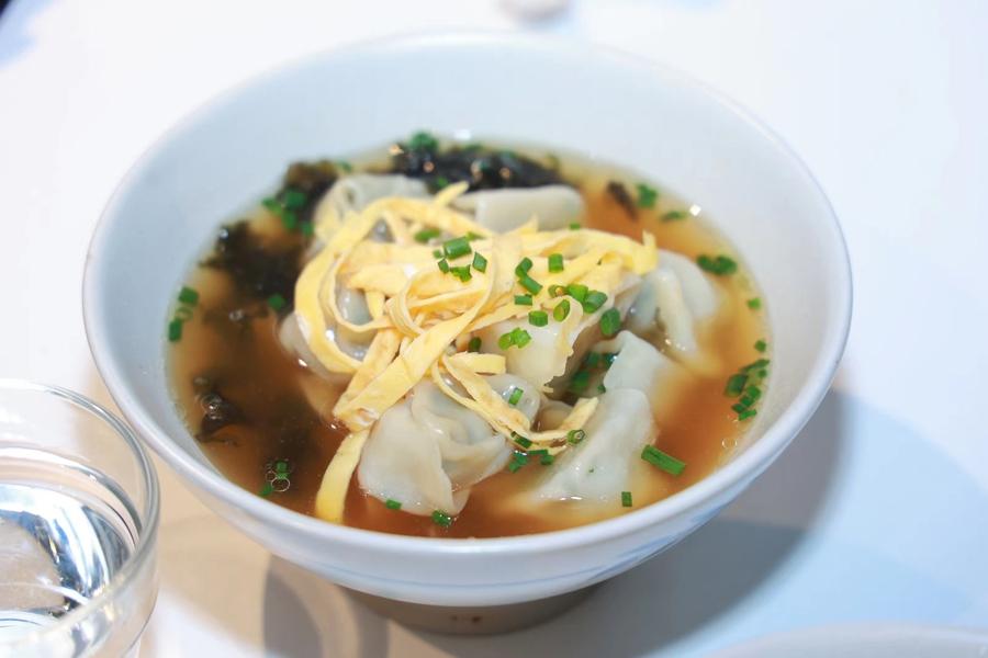 12月10日中午的上海國泰電影院餐廳內,菜肉餛飩端上來時,油香撲鼻,白霧升騰。瓷碗中央,十隻白胖胖的餛飩半浮半沉,一口咬下去,翠綠的薺菜與粉嫩的肉糜糾纏可見。金黃的蛋皮絲、紫黑的紫菜、嫩黃的蝦皮、翡翠般的蔥花,從餛飩湯裏傳遞出的那股熨帖到心窩的暖意,用上海話說是“老樂惠額”——也可以理解爲“老落胃的”。