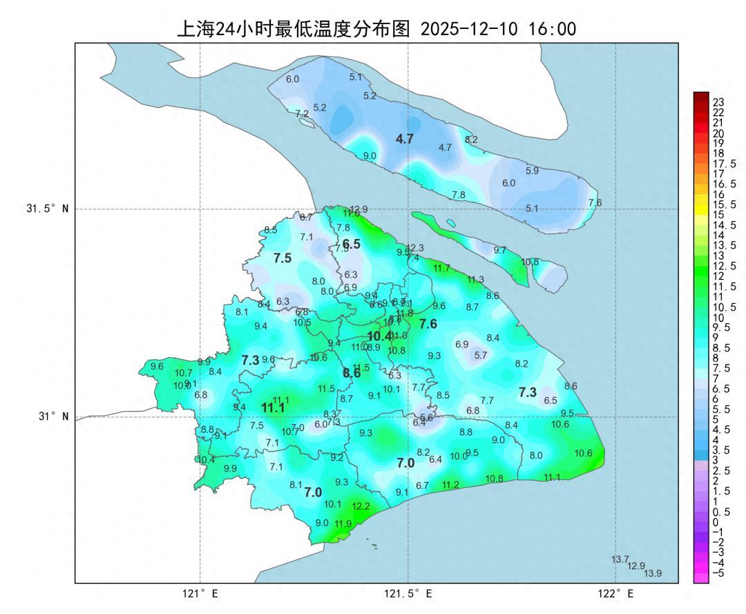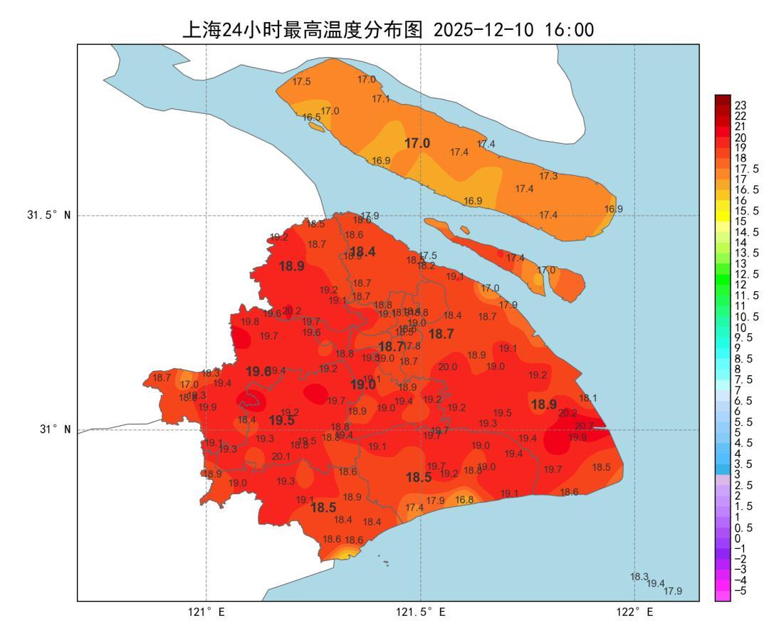 隨着暖溼氣流加強,今天的氣溫較昨日回升。早晨全市最低氣溫大多在6~10度之間,市區徐家彙站10.4度,崇明4.7度爲最低。上午多雲到陰,陽光稍有露臉,全市最高氣溫升至18~20度之間,市區徐家彙站18.7度。受短波槽東移影響,下午轉陰到多雲,半夜以前,局部地區可能會飄一些短時小雨。