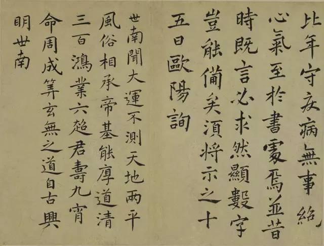“今人但見永興(虞世南)勻稱,率更(歐陽詢)勁瘠,琅琊(顏真卿)雄沉,誠懸(柳公權)強毅,與會稽(王羲之)分鑣,而不察其爲祖宗本貌,自粲如也。”