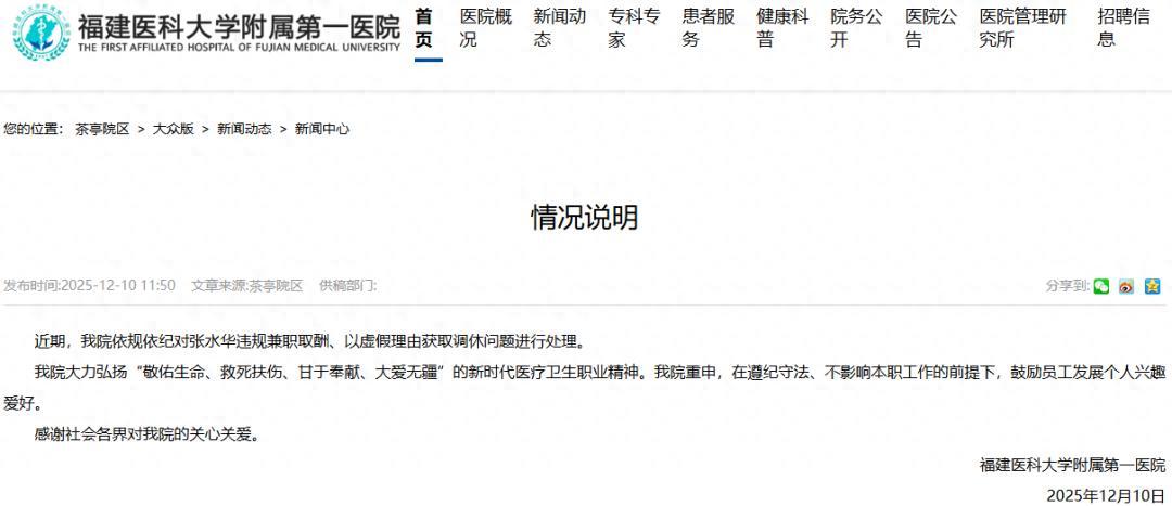12月10日,福建醫科大學附屬第一醫院發佈情況說明稱,依規依紀對“最快女護士”張水華違規兼職取酬、以虛假理由獲取調休問題進行處理。