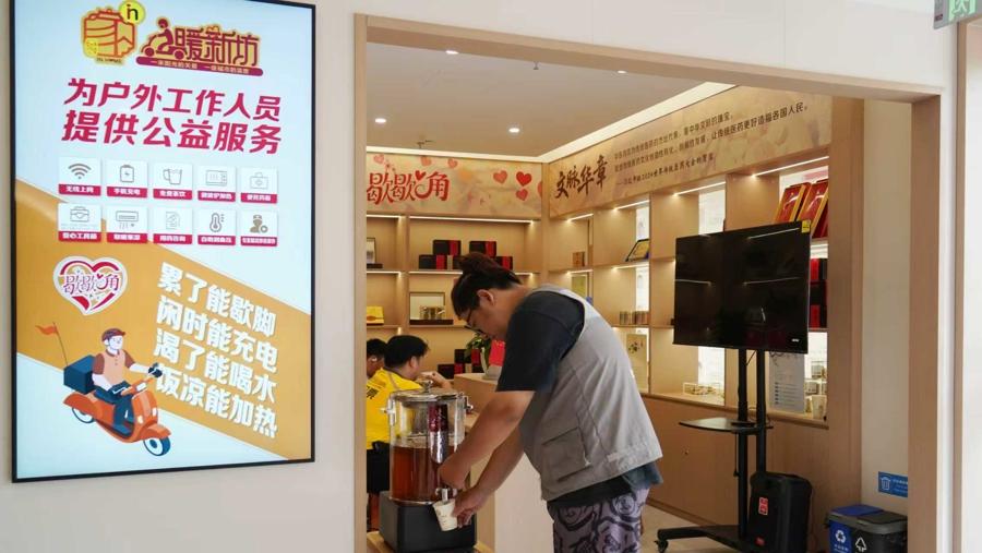 今年3月以來,朱涇鎮在各街區新建5個“暖新坊”,爲戶外工作者提供休憩港灣。