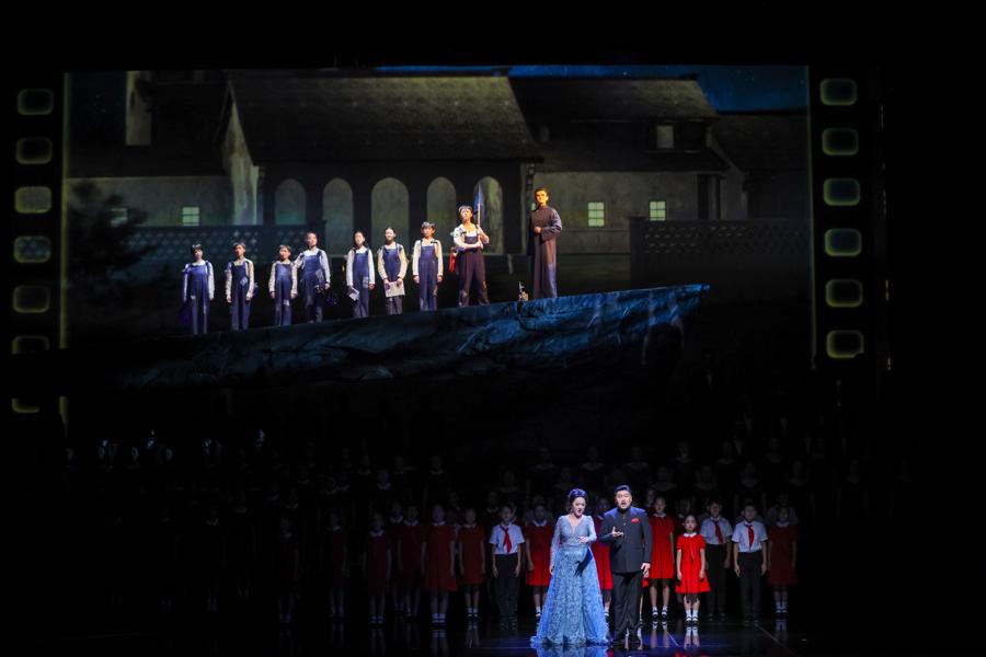 這種青春表達貫穿於每一首作品中:開篇的《五萬裏歌謠》採用朗朗上口的歌謠體,貼合孩童演唱的特質;《手挽手》則通過斑駁牆上的露天電影場景描寫,喚起60後、70後、80後的集體回憶,更穿插《賣報歌》等經典老歌旋律,讓新創作品與觀衆記憶形成“雙向奔赴”的共鳴。而主題歌《新旅》與結尾朗誦,以新安旅行團老戰士的視角回望過去、展望未來,含蓄傳遞出“所有紀念都是爲了更好前行”的深意。作品命名《新旅》既是新安旅行團的簡稱,更寓意上海歌劇院與中國文藝事業永遠行進在新的旅程上。