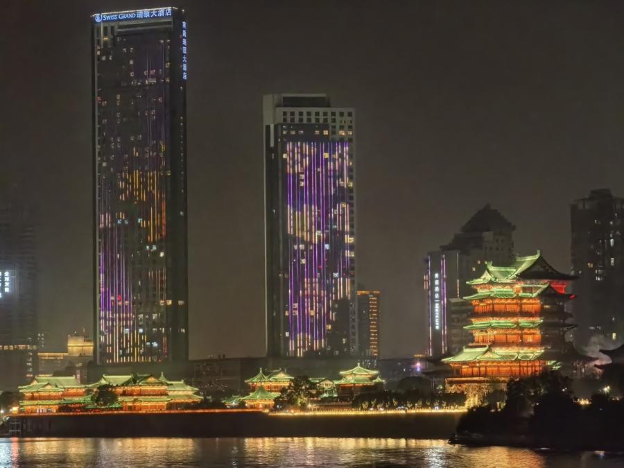 夜間,兩岸樓羣變身電子大屏上演燈光秀,與“紅火”璀璨的八一大橋相映成趣。贛江遊輪的舞臺上,沉浸式劇目《新琵琶行》準時開場。裝扮成白居易和唐代歌姬的演員們一起,將觀衆帶入“楓葉荻花秋瑟瑟”的潯陽江頭,讓歷史在江風中“復活”。現代與經典在“逝者如斯夫”的江水裏,傳承綿延。