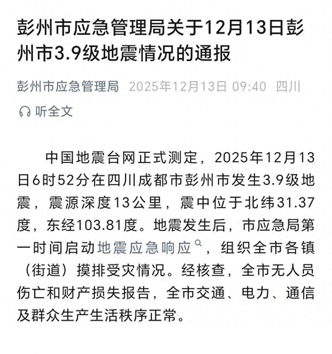 2025年12月13日6時52分在四川成都市彭州市發生3.9級地震,震源深度13公里,震中位於北緯31.37度,東經103.81度。經彭州市應急局全面 覈查,全市無人員傷亡和財產損失報告,全市交通、電力、通信及羣衆生產生活秩序正常。