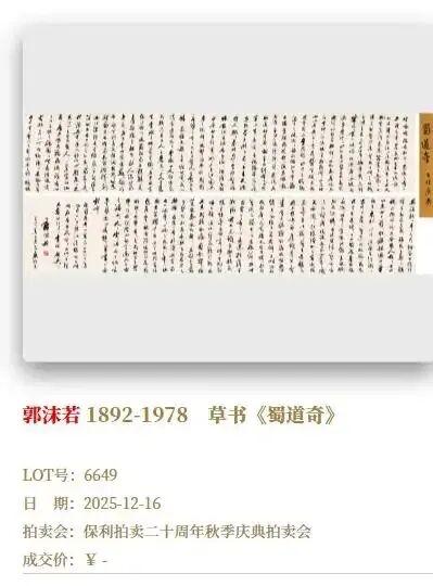 查詢發現,截至12月12日,保利拍賣官網仍未撤下該拍品,其信息顯示作品 “傳承有序、原裝原裱”,爲郭沫若自作詩手卷,在拍賣市場極爲罕見。郭庶英方面透露,曾與保利溝通但遭拒絕,對方堅持委託人有權處分。據業內人士介紹,拍賣行業多依託委託方提供的來源信息,僅做形式審查,遵循 “聲明不保證權屬” 慣例,若委託方隱瞞實情,拍賣方難避風險。