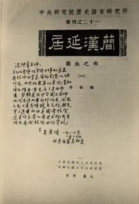 時光飛逝,1973年,吳景禎作爲美國民間代表訪華,會見了沈仲章。1977年,勞榦主編的《居延漢簡·圖版之部》在臺灣再版。書內每張圖版,都是簡牘運到香港後,由沈仲章拍攝的。全書六百多圖的頁序及每圖佈局,也都由他編排。吳景禎託美國漢學家去臺灣購得此書後帶回美國,後寄往上海,扉頁題詞寫道: