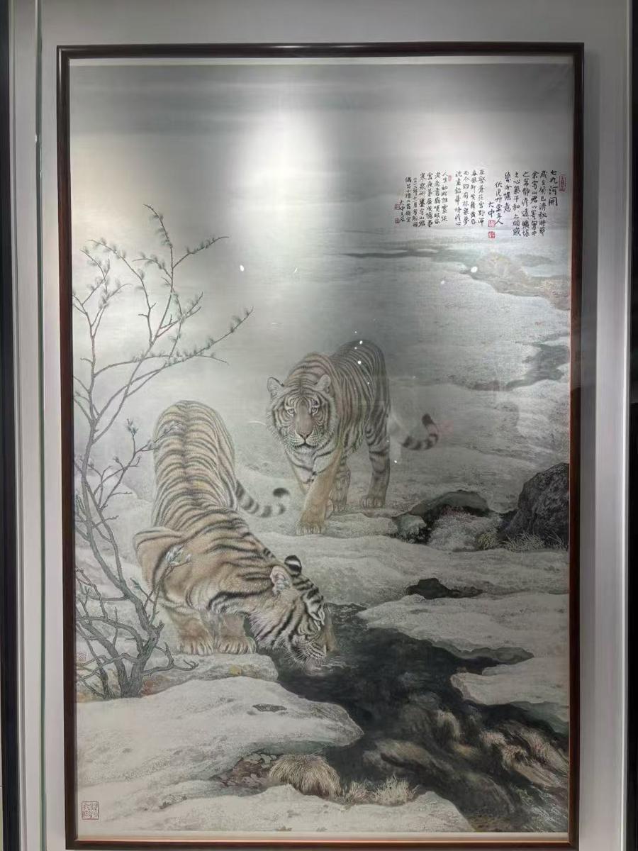馮大中尤以畫虎享譽畫壇。他深耕翰墨丹青領域,其筆下虎嘯山林之威、山水含情之態,皆以詩詞意境爲魂。工筆的纖毫畢現與寫意的逸興遄飛在此交融,恰是“詩中有畫,畫外生詩”文人理想的生動註腳。郭興文則以書法爲骨、詩詞爲魂,筆鋒起處如龍蛇騰躍,詩中文人雅興和家國情懷力透紙背。他秉持“以詩養書,以書傳詩”的理念,將歷史哲思凝於筆端,在墨痕起伏間澎湃。此次展覽以"詩書畫三位一體"爲核心命題,精選馮大中工筆重彩與水墨佳構,郭興文書法題跋與詩賦作品,共呈“詩畫相生”的古典美學意蘊。