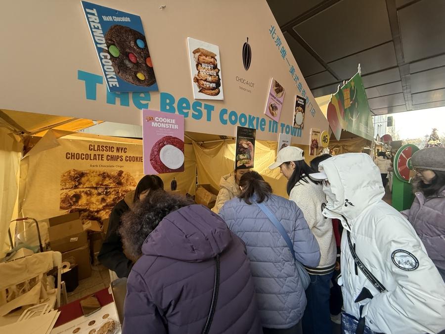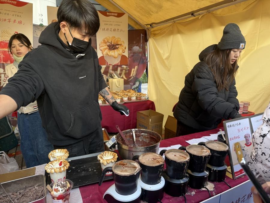 記者在現場看到,暖冬的午後,這裏人山人海,從露出品來看,既有核心商圈熱門榜常客和風靡社交平臺的網紅品牌,也不乏各大頂流市集的“排隊王”。紮根於上海的精品巧克力品牌BeanBANG在中信泰富設有門店,此次來到市集,帶來了奶油蘋果糖和前灘公園巷的季節限定“烤棉花糖熱巧”。“現在買熱巧,要等一個小時後取。”主理人在現場忙着現制熱巧克力,後排“戴”上棉花糖花朵的杯子已經排成方陣,但是熱巧的製作較慢,“製作的速度趕不上消費者的熱情。”