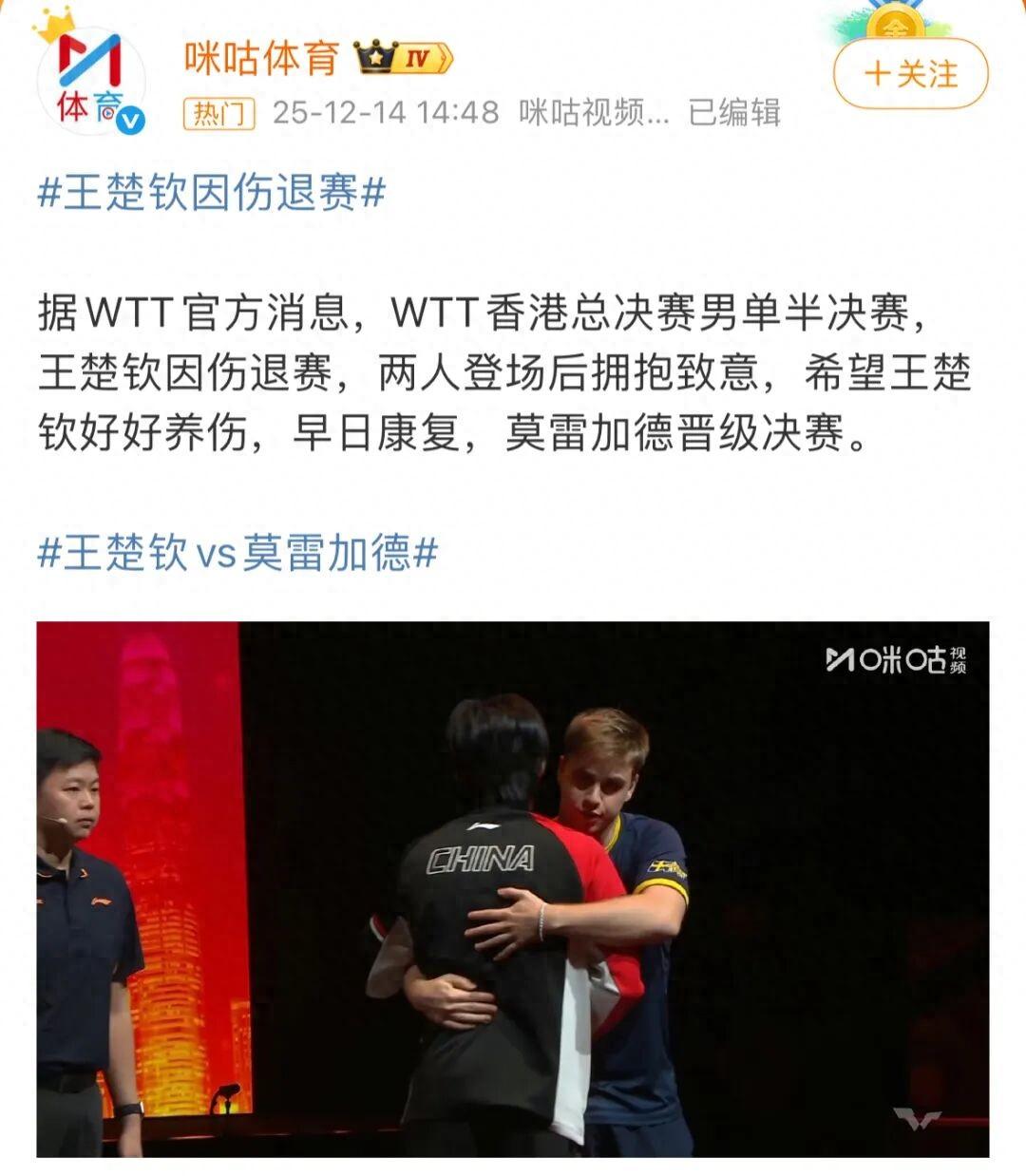 12月14日,據WTT官方消息,WTT香港總決賽男單半決賽,王楚欽因傷退賽,兩人登場後擁抱致意,希望王楚欽好好養傷,早日康復,莫雷加德晉級決賽。