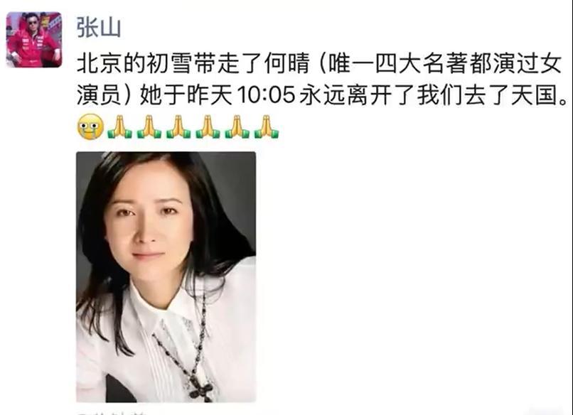 曾與何晴合作拍攝94版《三國演義》的演員張山在社交平臺發文稱“北京的初雪帶走了何晴(唯一四大名著都演過女演員),她於昨天10:05永遠離開了我們去了天國”,字裏行間滿是對故人離世的惋惜與不捨。