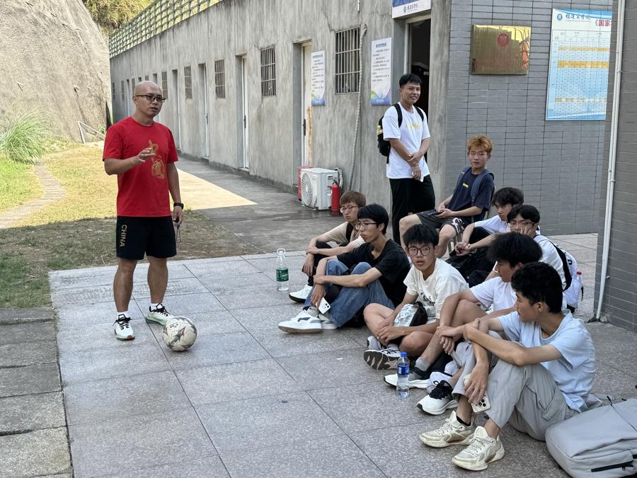 由於大多數同學並無足球基礎,第一堂課,老師從最基礎的腳內側停球、傳接球開始教起。這些動作對李哲羽來說早已輕車熟路,無需過多練習。讓他感到有些好奇的是任課老師——他穿着一件大紅色T恤,胸口印着醒目的“中國”,頭頂的鴨舌帽上繡着一面鮮豔的五星紅旗。