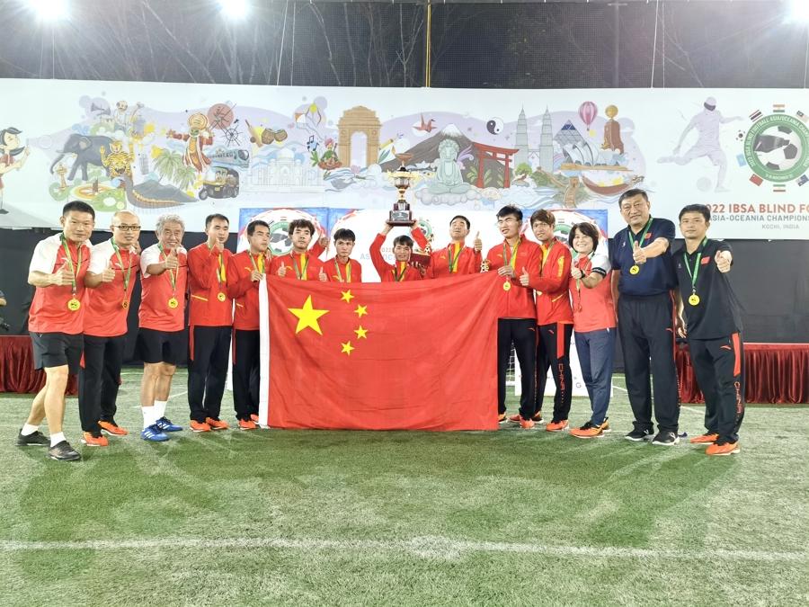 2022年,李進(左二)隨隊獲得盲足亞錦賽冠軍,中國男子盲足隊得以晉級巴黎殘奧會(受訪者供圖)