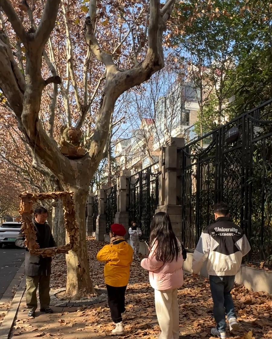 穿上落葉“外套”的潮玩裝置Labubu(拉布布)、立在樹杈間的小熊玩偶、懸掛在梧桐枝頭的落葉雨傘和球形裝置、用落葉拼成的拍照相框……深秋時節,申城一年一度的“落葉不掃”限時迴歸。作爲浦東新區7條“落葉不掃”景觀道路之一,鋪滿厚厚落葉的乳山路這幾天搖身一變,成了市民爭相打卡、拍照的“露天展館”,現場人流絡繹不絕。