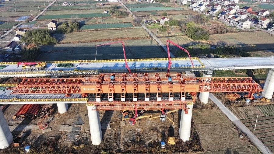 崇啓公鐵長江大橋北引橋採用公鐵合建方案,全長1069.27米。上層爲雙向6車道的1級公路,下層爲雙線高鐵+雙線城際。本次澆築的爲崇啓公鐵長江大橋城際側NC20-NC21號墩梁,長40.6米,寬12.2米,澆築混凝土總量344方,採用移動模架法現澆施工。