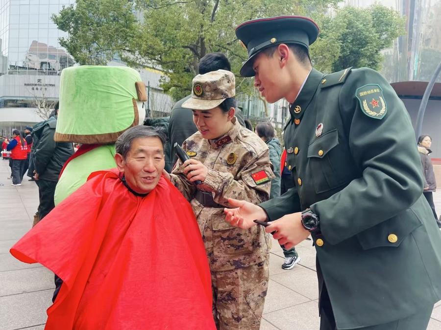 “1982年3月16日,我和其他4名民兵一起,走出上海市第一醫藥商店爲路人免費提供量血、稱體重、應急醫藥等服務,和你們一樣,也是爲了學習‘好八連’精神,更好地爲人民服務。如今看到我們南京路女子民兵連年輕的隊員在南京路傾情奉獻,彷彿看到了當年的自己,我知道紅色精神的賡續傳承從未斷代。”已過古稀之年的全國最美志願者、全國最美退役軍人陶依嘉,深情地與隊員們進行着交流。一位女民兵接過陶依嘉的血壓計,鄭重承諾:“請陶阿姨放心,我們一定沿着您的足跡,讓學八連的旗幟在南京路上高高飄揚!”