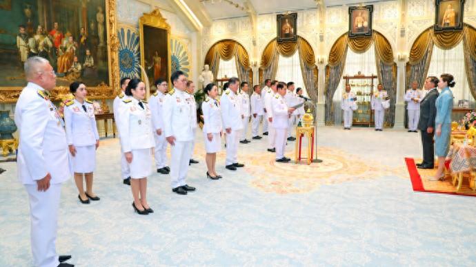 7月3日,在泰國曼谷律實宮,代理行使總理職權的泰國副總理兼交通部長素里亞·莊龍琅集率領改組後的新內閣成員向泰國國王瑪哈·哇集拉隆功宣誓就職。 新華社發
