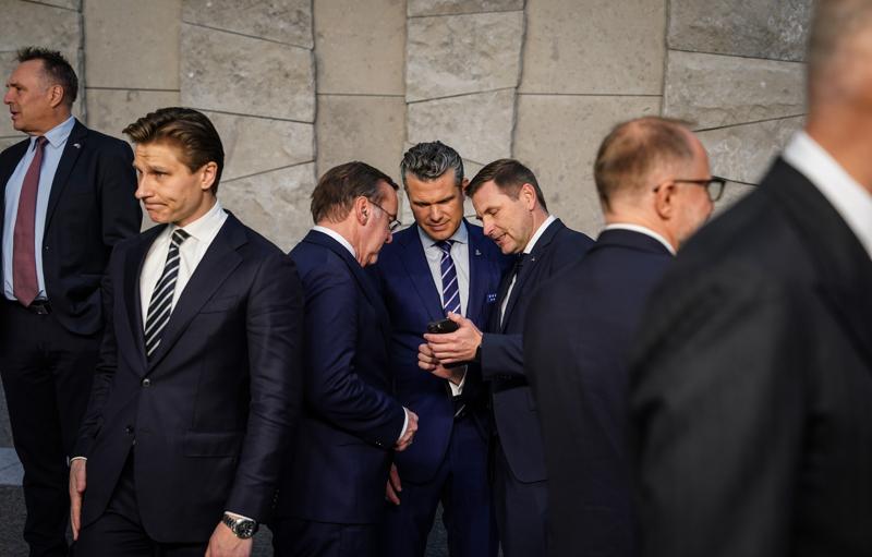 10月15日,在比利時布魯塞爾舉行的北約防長會議結束後,美國國防部長赫格塞思(中)與愛沙尼亞國防部長佩夫庫爾(右三)、德國國防部長皮斯托裏烏斯(左三)交談。新華社