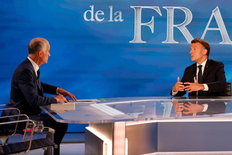 5月13日,法國總統馬克龍(右)在聖但尼參加法國電視一臺節目錄制。馬克龍在節目中說,歐洲若始終依賴美國將是“不負責任”。 新華社