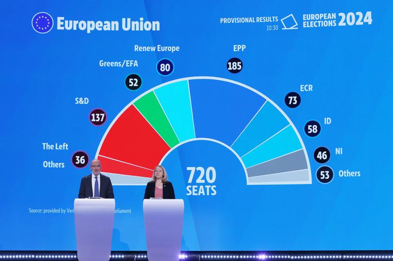 2024年6月,歐洲議會選舉,右翼和極右翼政黨席位增加。這是2024年6月10日在位於比利時布魯塞爾的歐洲議會拍攝的選舉臨時結果。新華社