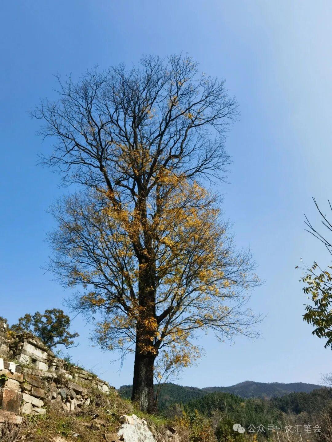 緣溪行,右拐入011鄉道,過龍潭峽谷,山重水複,即是大名鼎鼎的葉灣村。村前小瀑布下溪橋邊的紅檀樹已經落盡了狹葉,不復去年我來目睹它時的榮華,唉,我摸黑由打滿白霜的村子裏爬起牀,葉灣村的兩棵紅檀就是原動力。在樹下石桌石凳上小坐片刻,進村去。葉灣村石牆青磚黑瓦的民居保存得很不錯,從前應該是一個山寨般的堡壘,繞過新月般的水塘,一層層往裏走,好像是走入一隻洋蔥內部。我特別喜歡村巷盡處,傍山的那座木結構夯土牆的兩層樓房子,它的位置,好像是在洋蔥頭。去年我立在門前的陽光地裏,與房屋的主人,一位身材矮小的老頭子,一邊比劃,一邊大聲嚷嚷,交談了半天,他鄉音濃,耳朵也不太好。他愛喝啤酒,所以木柴堆旁邊,還有一個碼垛成列的啤酒瓶堆。夯土樓房被他保護得很好,伸出來的木柱頭與卯榫,都被他搭梯子上去,用膠帶與膠皮捆紮起來,以避風雨。今日他應是剛剛喫完中飯,在一樓右首廂房裏與老太太聊天,老夫婦倆都在大着嗓門叫喊,他們的聽力可能都不中,所以各人講着各人的話。我聽了一會兒,不得要領,遂鼓足勇氣,回頭繞去村外山坡上的墓地,墓地上另一棵懷抱粗紅檀樹還剩一半的金葉,挺立在藍天之下,墳塋之間,在陽光下被微風吹得簌簌作響!這是我這兩年在大別山裏,看見的最美的秋樹,華美,瑰麗,豐茂,挺秀,由幽冥中吸取力量,充滿了光輝,一邊承受着死亡,一邊讚美着當即。站立在村道邊向上仰視着它剛健的樹身與蓬勃的樹冠,我想到的是呂溫予唐代姚崇、宋璟諸名相的評價:“天光照身,宇宙在手”。它不離世間,純然顯現在這裏,好像也懂得龍樹的“八不偈”:“不生亦不滅,不常亦不斷;不一亦不異,不來亦不出。”它的確是一棵有龍性的樹。