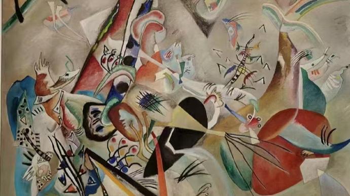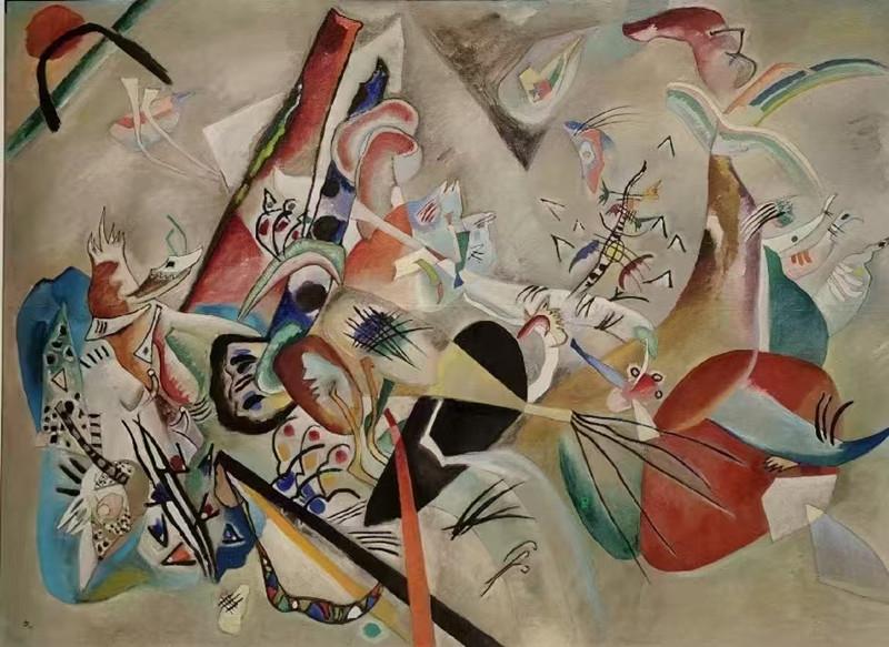 康定斯基的畫作《灰色之中》。康定斯基是當時最負盛名和最具影響力的抽象畫家,1922年到1923年之間任教於著名的藝術學校“包豪斯”,見證了魏瑪精神的現代化。