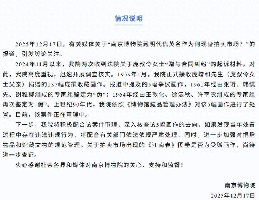 2025年12月17日,有關媒體關於“南京博物院藏明代仇英名作爲何現身拍賣市場?”的報道,引發輿論關注。