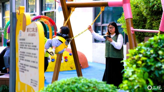 假期的下午1點,徐彙區康健街道黨羣服務中心二樓,寶寶屋的稚嫩童聲與閱覽室裏長者翻書的沙沙聲交織,其樂融融。伴隨着上海老齡化與低出生率並存的人口結構性變化,“老幼共託”成爲雙職工家庭兼顧老人照護與幼兒託管的理想方案。