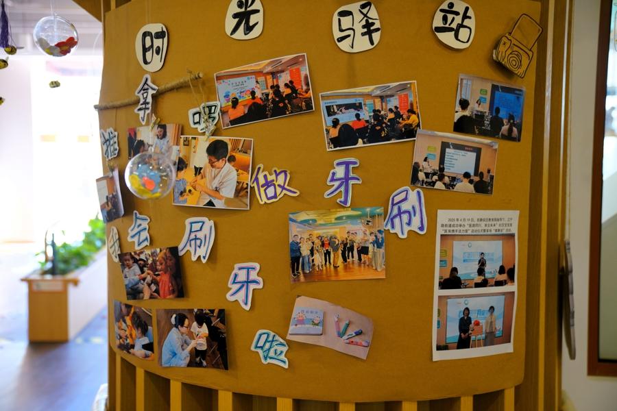 靜安區江寧路街道社區綜合爲老服務中心二樓,寶寶屋門口貼着很多活動照片。(李相如攝)