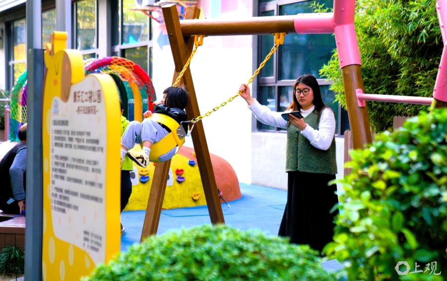 徐彙區康健街道黨羣服務中心外的口袋公園,家長帶着孩子盪鞦韆。(李相如攝)