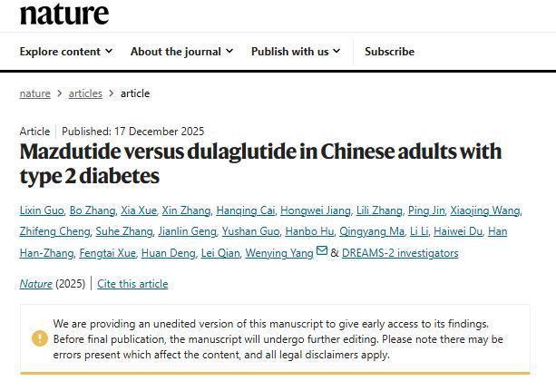 值得一提的是,中國減重降糖創新藥——瑪仕度肽成爲全球唯一同時登頂《自然》和《新英格蘭醫學雜誌》兩大科學頂級刊物的GLP-1藥物。此次登頂的兩項Ⅲ期臨牀研究分別是瑪仕度肽在2型糖尿病患者中的單藥治療研究(DREAMS-1)和與口服降糖藥聯合使用的研究(DREAMS-2),均基於中國患者的臨牀數據。