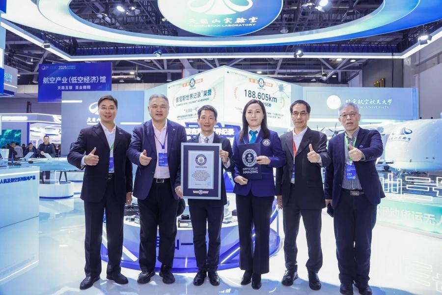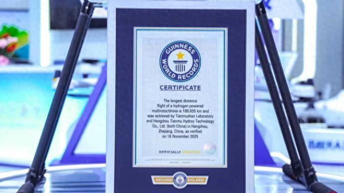 “‘天目山一號’氫動力多旋翼無人機,於2025年11月16日在北京航空航天大學杭州國際校園上空,成功完成了不間斷飛行188.605 公里(用時4小時17分 55秒)的飛行挑戰,創造了全新的世界紀錄。”日前,在第七屆浙江國際智慧交通產業博覽會上,吉尼斯世界紀錄(Guinness World Records)官方認證官宣佈,“天目山一號”無人機(量產型)創造了“氫燃料電池驅動的多旋翼無人機飛行的最長距離/ Longest distance flight of a hydrogen powered multirotor/drone”世界紀錄。