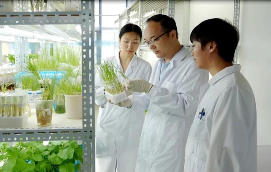 華中農大水稻團隊在觀察植物樣本(圖源:央視新聞)