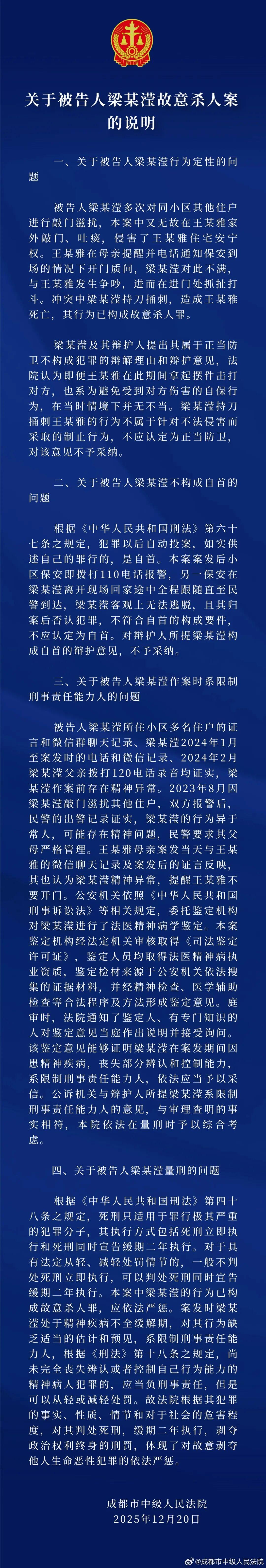 2025年12月20日,四川省成都市中級人民法院一審公開宣判被告人梁某瀅故意殺人一案,對被告人梁某瀅以故意殺人罪判處死刑,緩期二年執行,剝奪政治權利終身。