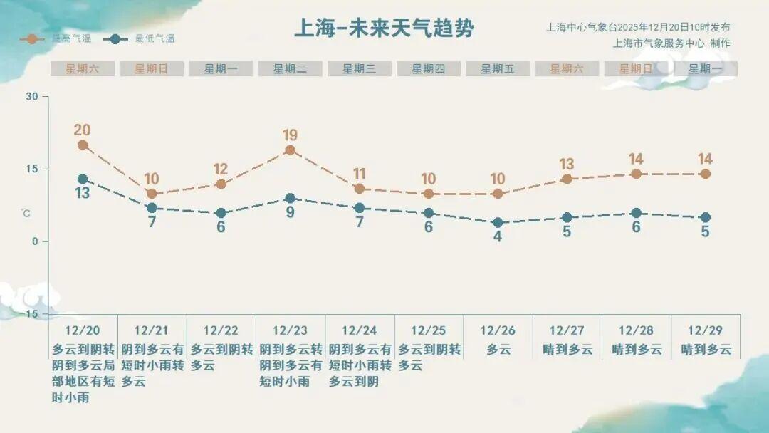 冷暖空氣輪番控場,下週二又將出現一個氣溫高點,最高可達19℃,伴隨着陰天小雨,體感再次變得暖溼;下週三前後還將有一次冷空氣影響,申城將開啓新一輪入冬衝刺。