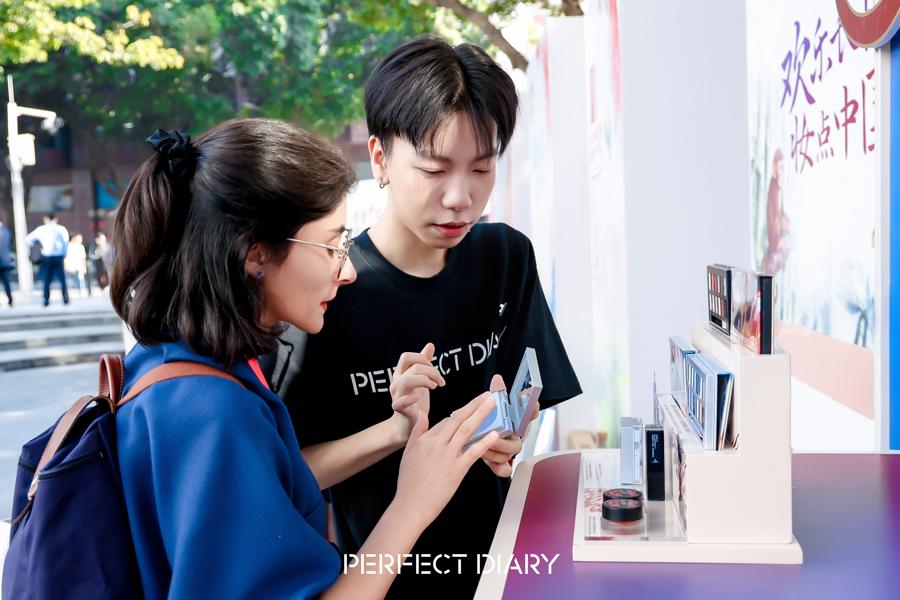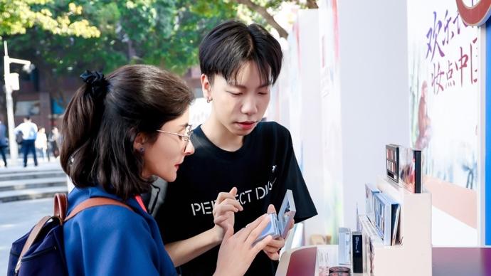 除主題花車外,現場還特設試妝區。品牌方選用完美日記×電影《哪吒之魔童鬧海》聯名十二色眼影,爲駐足市民定製專屬妝容,花城火系與錦繡冰系妝容二者可隨心選擇。這場試妝既妝點市民容顏,更以國風特色,讓外國友人沉浸式感受東方妝容的獨特魅力,讓“中國美”可觸可感。