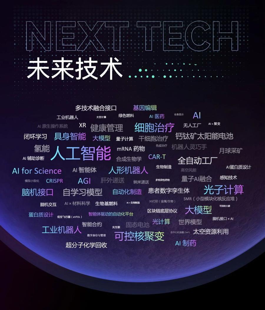 首日的閉門討論延續到深夜;第二天是公開論壇,包括髮布未來趨勢報告,展示未來技術、未來人才等。大會熱議的領域涵蓋AI、光計算、生物設計、可控核聚變,以及人類文明的星際擴張。