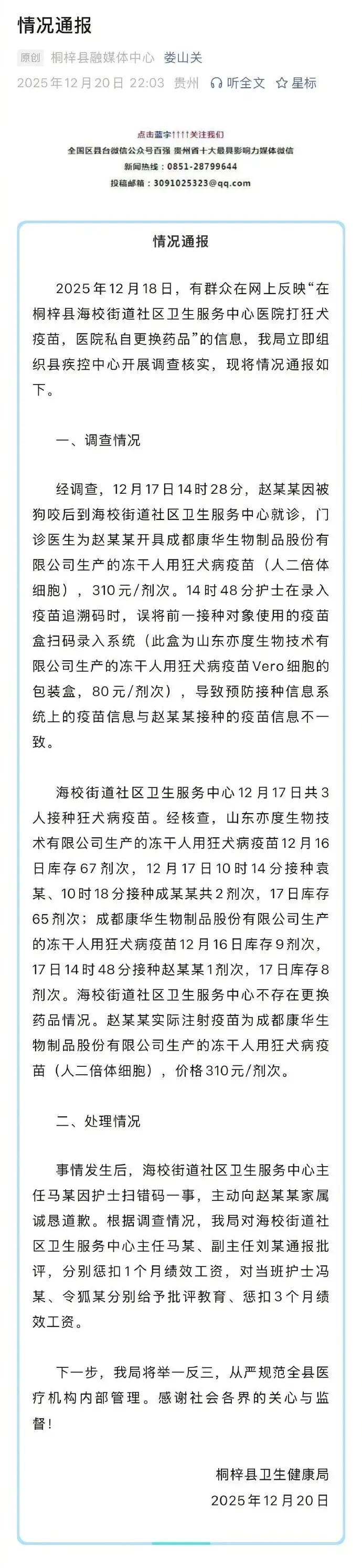 通報稱,2025年12月18日,有羣衆在網上反映“在桐梓縣海校街道社區衛生服務中心醫院打狂犬疫苗,醫院私自更換藥品”的信息,該局立即組織縣疾控中心開展調查覈實,情況通報具體內容如下。