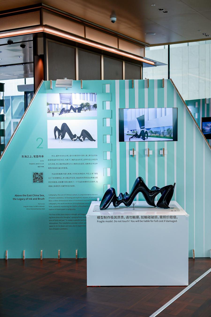 比如,爲上博東館南廣場量身打造的三件作品風格各異。《東海之上,筆墨傳承》以中國書法爲靈感,將二維的筆跡轉化爲三維的動態造型,抽象表達書法中筆勢的韻律與留白的意境,爲觀衆提供一個可坐臥休憩的互動場所。